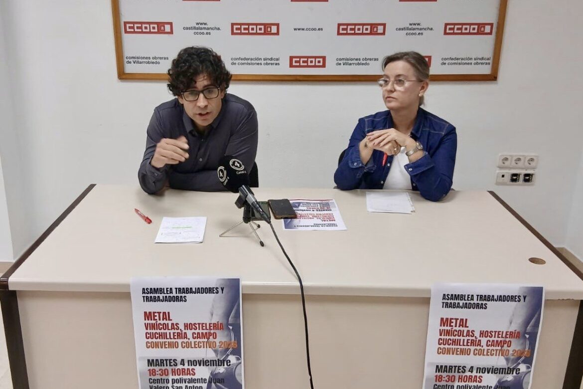El secretario general de CCOO Albacete, Paco Gómez, y la responsable de CCOO en la comarca, Engracia Pérez, han informado esta mañana de la asamblea que tendrá lugar el próximo martes 4 de noviembre, a las 18:30 horas, en el Centro Polivalente Juan Valero San Antón, para explicar a las personas trabajadoras cuál es el objetivo de la negociación colectiva del año 2026.