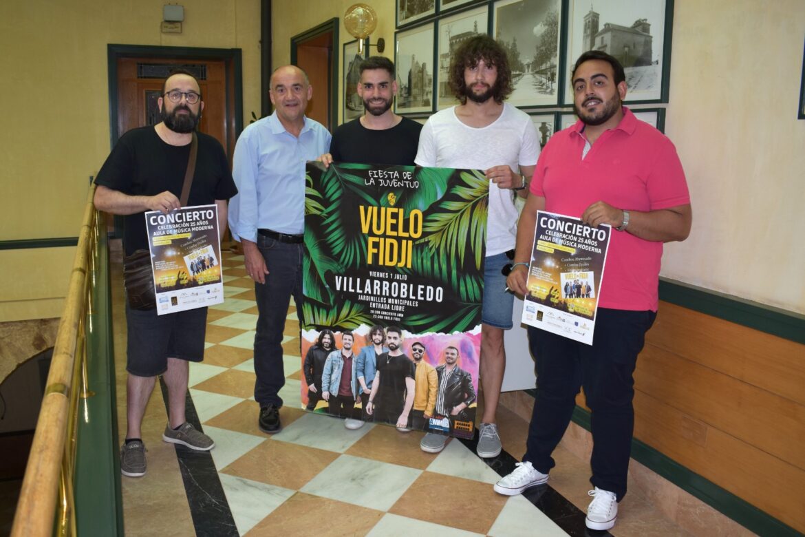 La Fiesta de la Juventud contará con el tradicional concierto de fin de curso del Aula de Música Moderna, a cargo de los combos de alumnos, que mostrarán todo lo aprendido durante este curso. También los profesores tocarán varios temas y todos ellos se convertirán en teloneros del artista invitado, la banda Vuelo Fidji, formada en su mayoría por músicos locales y con la voz del paisano Toño Cabañero, que no es la primera vez que participa en la Fiesta de la Juventud.