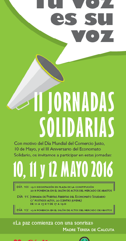 A las 7 de la tarde de hoy martes tendrá lugar la primera de las actividades organizadas por Cáritas en las II Jornadas Solidarias «Tu Voz es Su Voz» Hoy, coincidiendo con el día Mundial del Comercio Justo, tendrá lugar junto al Kiosko del Abuelo, ubicado en la Plaza de la Constitución, una degustación de productos de Comercio Justo. Posteriormente, habrá una ponencia a cargo de Ana Sancho Barrera, técnico del equipo de Economía Solidaria de Cáritas Española, a las 8 de la tarde en el Salón de Actos del Mercado de Abastos.