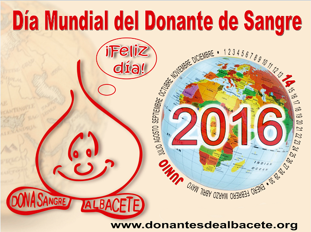 Con motivo de la celebración mañana 14 de junio del Día Mundial del Donante de Sangre, La Asociación y Hermandad de Donantes de Sangre de Albacete han querido felicitar a todos los donantes de sangre en su día y agradecerles su continuada labor altruista salvando vidas a personas que sufren accidentes, enfermedades, o necesitan un trasplante de órganos, etc..