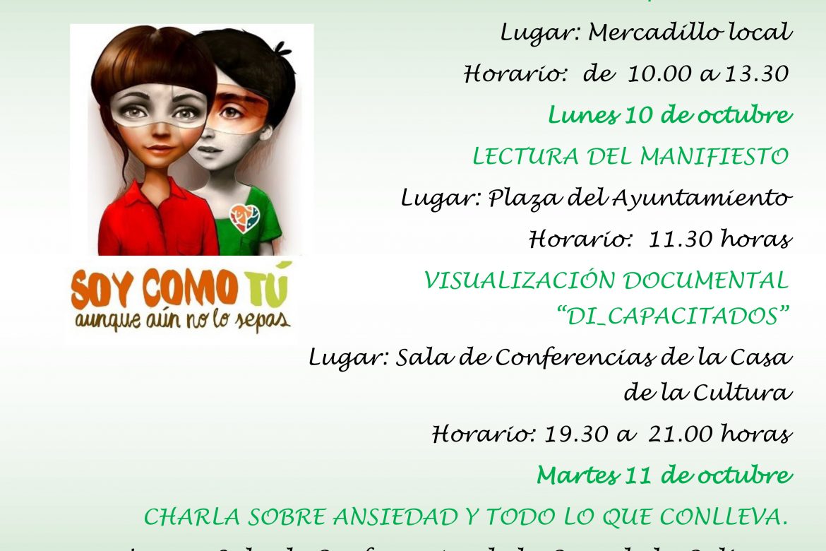 Para esta tarde está prevista la proyección del documental “DI_CAPACITADOS”, en la sala de conferencias de la Casa de la Cultura a partir de las 19:30. En este mismo lugar e idéntico horario, AMAR cerrará la programación mañana martes con una charla sobre la ansiedad y sus efectos, abierta a todo el público que desee asistir.