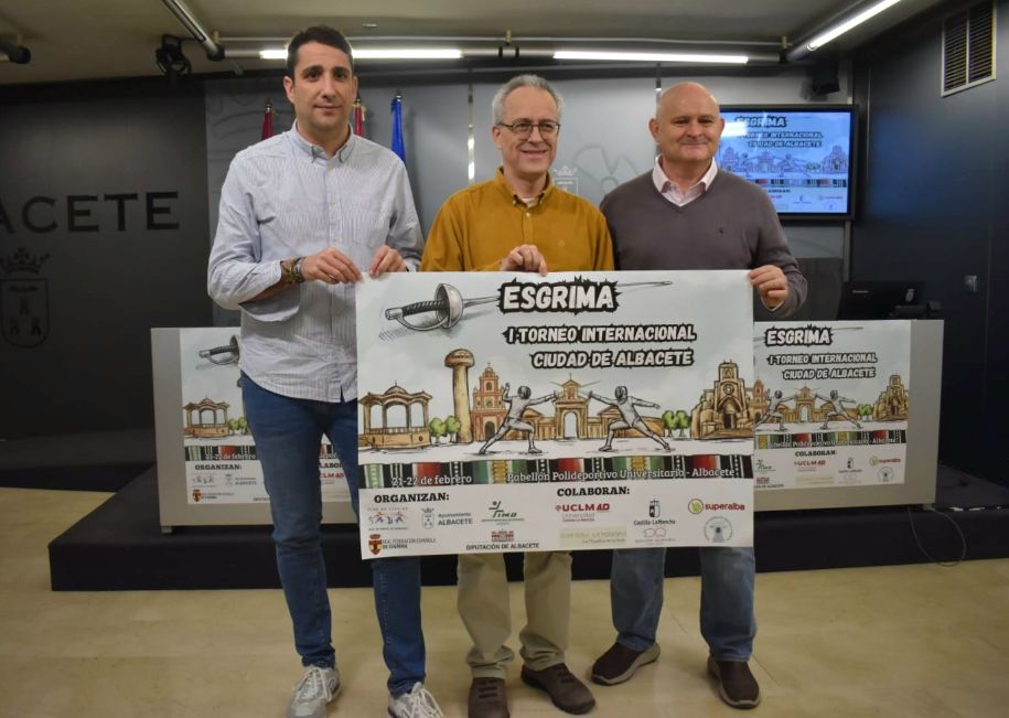 Junto al concejal del área en el Ayuntamiento de la capital, Francisco Villaescusa, y al presidente del club Sala de Armas, Luis Martínez, Sancha ha destacado la importancia de acoger, por primera vez, en la provincia esta cita en modalidad absoluta y en formato open, con la participación de deportistas procedentes también de países europeos y latinoamericanos, bajo el nombre: I Torneo Internacional de Esgrima ‘Ciudad de Albacete’.