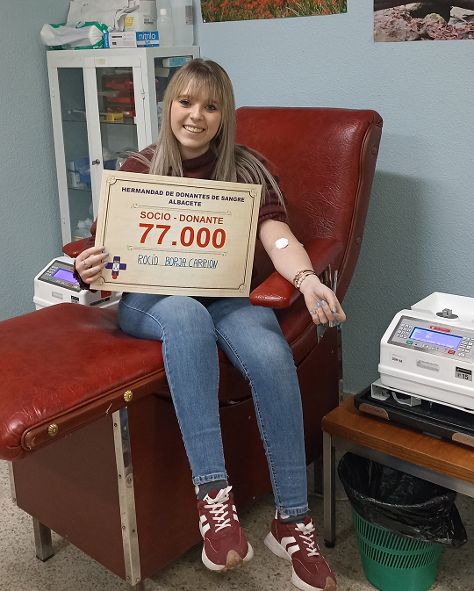 Albacete, 3 de febrero de 2026. En la tarde de ayer, ROCIO BORJA CARRIÓN, se convirtió en la socio-donante número 77.000 inscrita en el registro de la Hermandad de Donantes de Sangre de Albacete al efectuar su primera donación en el Hospital Universitario de Albacete.