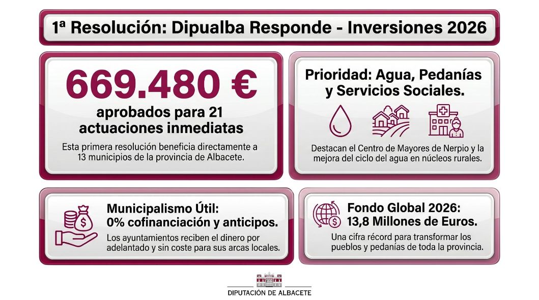 La Diputación de Albacete, encabezada por Santi Cabañero, ha aprobado la primera resolución de su gran programa vertebrador, el ‘Dipualba Responde – Inversiones 2026’, autorizando un total de 669.480 euros. Con esta inyección económica, se impulsan 21 actuaciones que beneficiarán directamente a 13 ayuntamientos de la provincia: Peñas de San Pedro, Villa de Ves, Villaverde de Guadalimar, Ossa de Montiel, Bogarra, San Pedro, Molinicos, Barrax, Nerpio, Casas-Ibáñez, El Ballestero, Letur y Pozo Cañada.