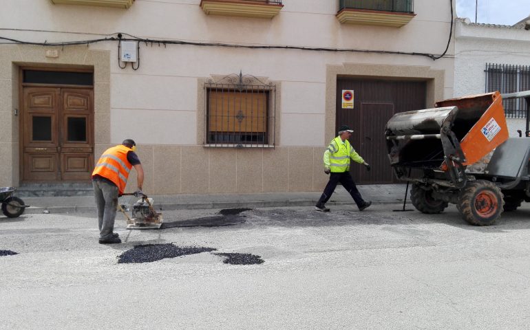 Dos empleados del Plan Extraordinario de Empleo se encargan estos días del bacheado de las diferentes calles de la localidad