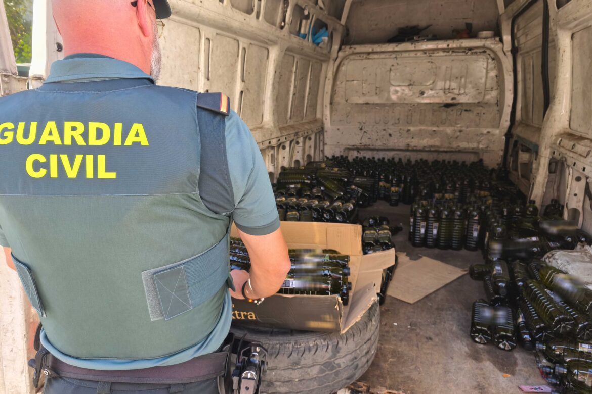 Una vez interceptada la furgoneta e identificados sus ocupantes, los agentes localizaron en su interior 511 botellas de aceite de oliva de las que no pudieron acreditar su licita procedencia.
